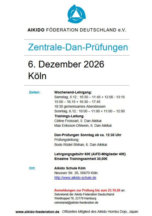 6.12.2026 Lehrgang mit Céline Froissart (Paris)/Max Eriksson (Berlin) und Aikikai-Dan-Prüfungen in der Aikido Schule Köln